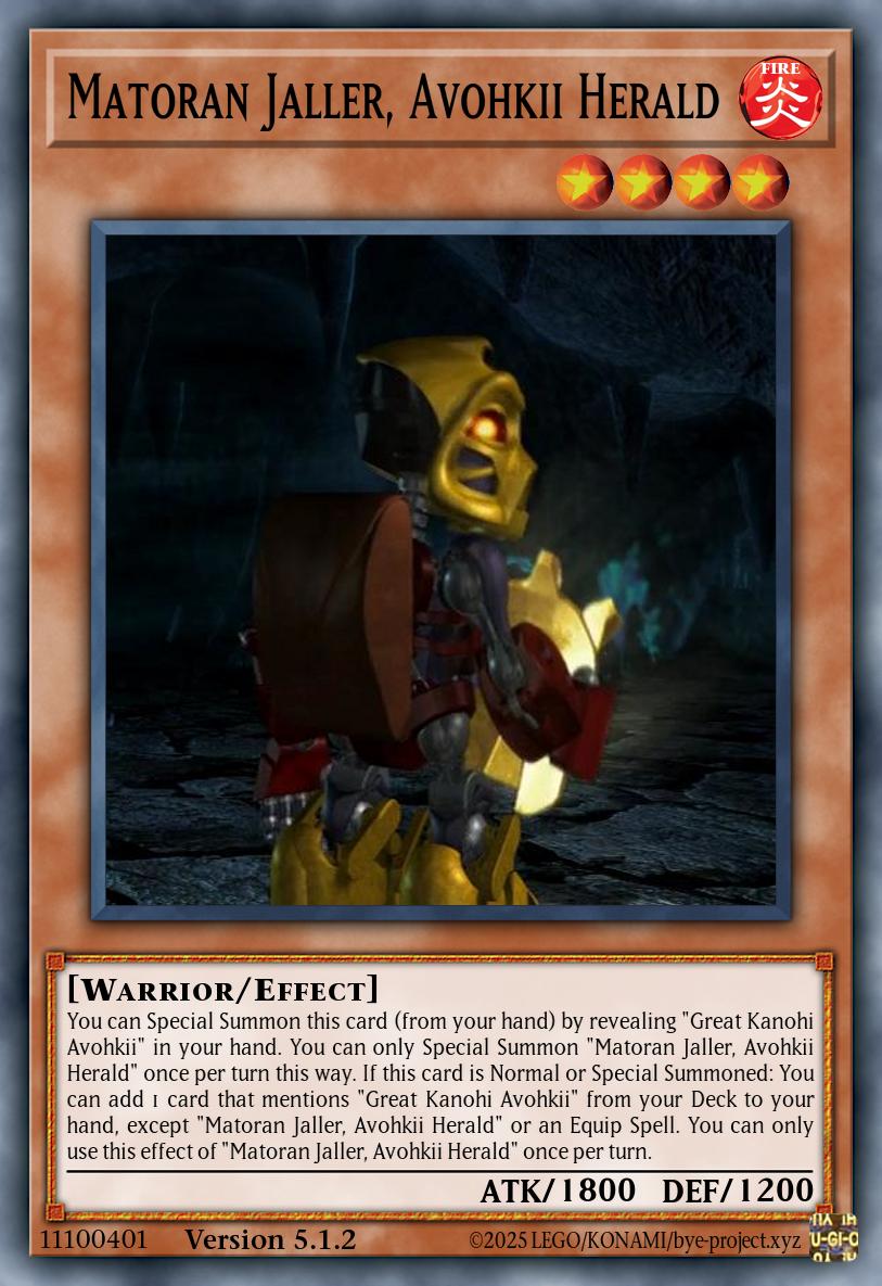 You can Special Summon this card (from your hand) by revealing “Great Kanohi Avohkii” in your hand. You can only Special Summon “Matoran Jaller, Avohkii Herald” once per turn this way. If this card is Normal or Special Summoned: You can add 1 card that mentions “Great Kanohi Avohkii” from your Deck to your hand, except “Matoran Jaller, Avohkii Herald” or an Equip Spell. You can only use this effect of “Matoran Jaller, Avohkii Herald” once per turn.