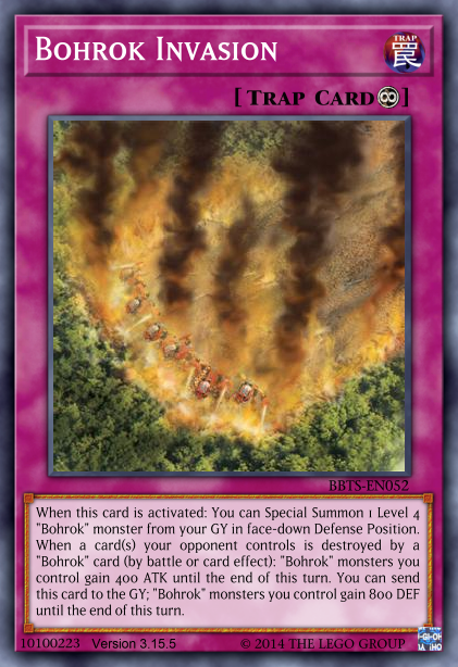 Bohrok Invasion Continuous Trap When this card is activated: You can Special Summon 1 Level 4 “Bohrok” monster from your GY in face-down Defense Position. When a card(s) your opponent controls is destroyed by a “Bohrok” card (by battle or card effect): “Bohrok” monsters you control gain 400 ATK until the end of this turn. You can send this card to the GY; “Bohrok” monsters you control gain 800 DEF until the end of this turn.
