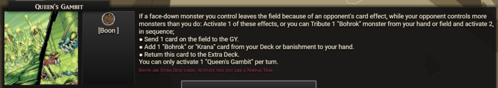 Since with this it’s basically guaranteed the Bohrok setup will be contested by something, they have the Trap Boon Queen’s Gambit at their disposal for equally reliable access to counterplay. Whenever your opponent’s effect removes your Bohrok from the field, and you now have fewer monsters (to keep it from being used for squashing a comeback from the losing player), you get to respond with a search or your own removal effect – and if you Tribute a monster as well, you can either do both of these things, or do one of them and return the Boon to the Extra Deck to use it again later. I got a bit cute with the mechanics on this one, so yes, you can also activate it just to put it back. Do what thou wilt.