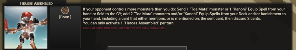 For the Toa, the problem to fix was how much you had to rely on random chance to even see the particular Kanohi or Toa you would need to crack a given board. So their Spell Boon, Heroes Assembled, takes the form of a simple searcher flavored by utilizing the mentions of specific Toa Mata on the six Great Kanohi. One thing I wanted to make really sure of is that you don’t always default to using this, but just when really needed – so on top of requiring you to have fewer monsters, it’s also a -1 in card advantage (though you can make it neutral by triggering a discarded Kanohi’s search effect, as is expected). Technically you only get one copy of the Boon, but if so inclined I know a guy who can recover it …